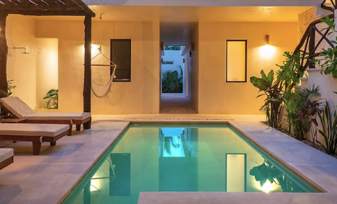 Nell’area comune esterna di CASA YAAKUN è presente una grande piscina circondata da un giardino tropicale, e diverse amache in legno locale – realizzate a mano – oltre alla “palapa” o pergolato in legno. Questo spazio riceve molta luce naturale, ma senza troppo sole.