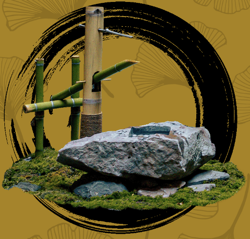 La prima è lo Tsukubai, una piccola vasca in pietra in cui scorre, con un moto perpetuo, l’acqua, usata tradizionalmente per la purificazione. Il movimento genera un suono attutito sul bambù, come a scandire il tempo che passa inesorabile.