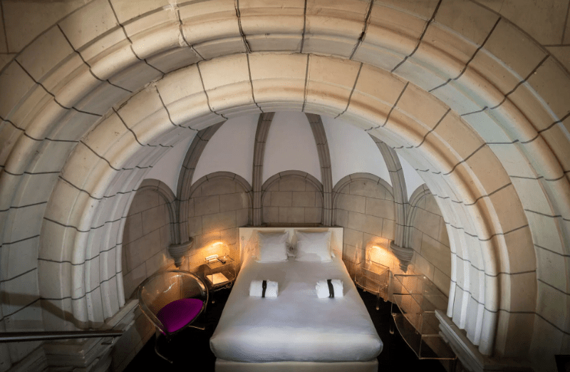 Si continua con Nantes, dove c’è il Sozo Hotel, qui si respira lo spirito di una cappella ottocentesca sconsacrata. Un luogo davvero insolito dove dormire in Francia, in cui interagiscono insieme al classico design di Starck o Eames, anche delle opere d’arte contemporanea e luci al neon. Fiore all’occhiello sono proprio le camere Séduction le quali sono incastonate sotto volte a forma di stella. Ma ci sono anche le camere Tentation, dove le coppie si lasciano coccolare da originali vetrate multicolori.