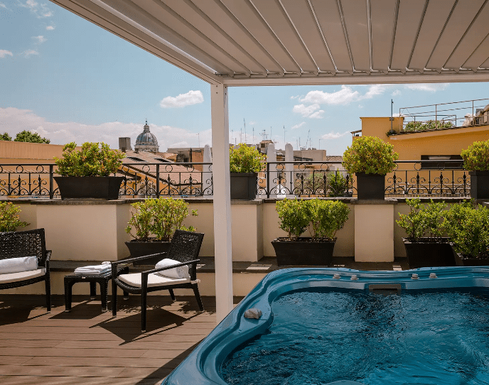 Si trova sul giardino pensile dell’albergo, l‘Acquaroof è il luogo ideale per godere di una vista mozzafiato su Roma, a qualsiasi ora del giorno. Gustare anche una colazione, un pranzo, un drink, una cena, sono i momenti da non perdere.