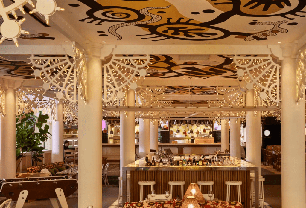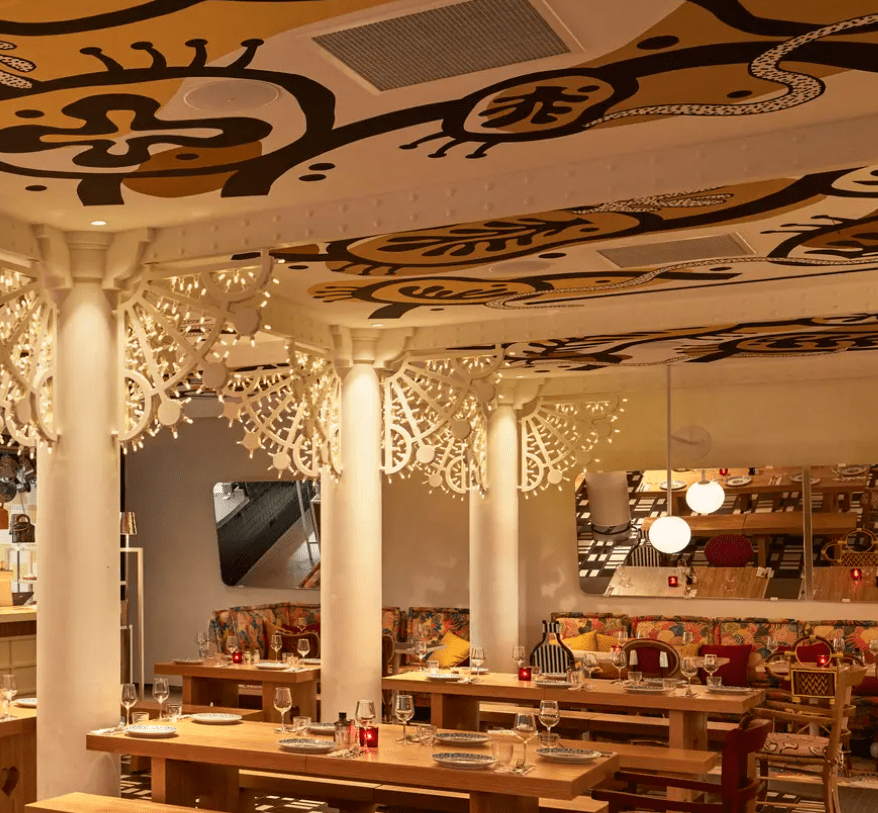Al centro del ristorante, un bancone in legno d’ulivo domina su un pavimento di piastrelle in terracotta, mentre sculture luminose sospese, ispirate alle luci che rischiarano le strade in festa, illuminano la sala. Tra i tre edifici si trovano un patio verdeggiante e un vicolo fiorito coperto da un tetto di vetro retrattile. Il rooftop ospita una piscina a mosaico con ombrelloni per ripararsi dal sole, sedie a sdraio e bar.