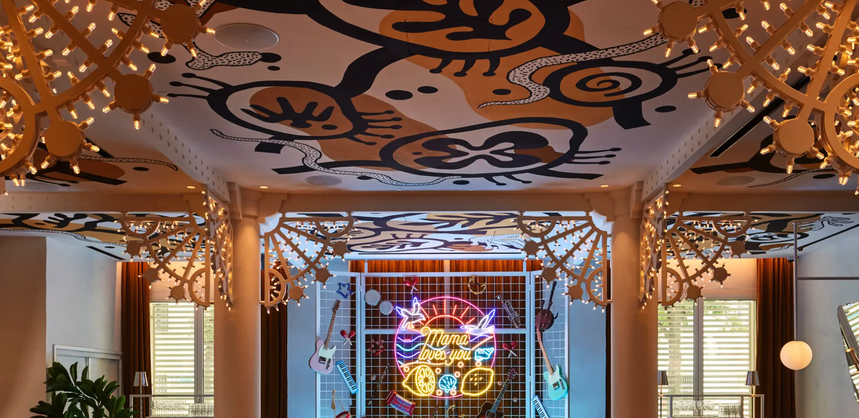 Al centro del ristorante, un bancone in legno d’ulivo domina su un pavimento di piastrelle in terracotta, mentre sculture luminose sospese, ispirate alle luci che rischiarano le strade in festa, illuminano la sala. Tra i tre edifici si trovano un patio verdeggiante e un vicolo fiorito coperto da un tetto di vetro retrattile. Il rooftop ospita una piscina a mosaico con ombrelloni per ripararsi dal sole, sedie a sdraio e bar.