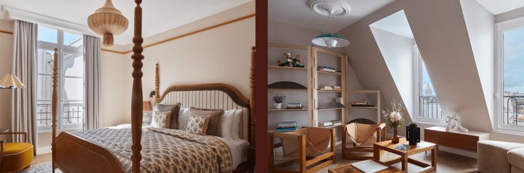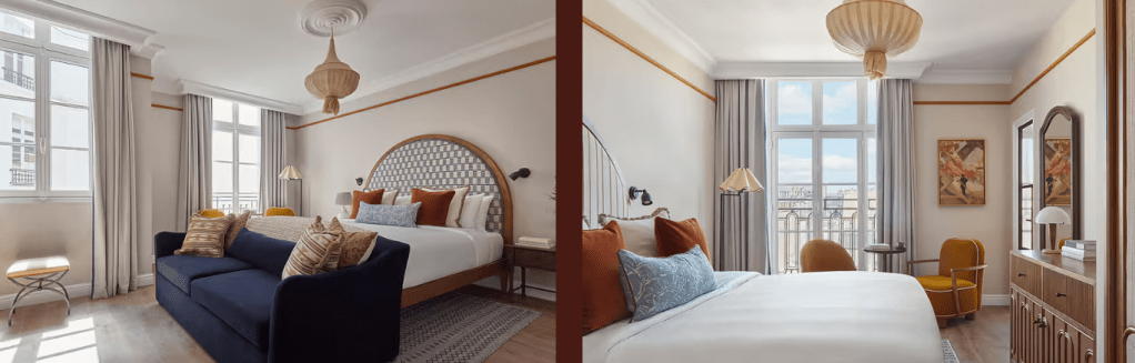 Ognuna delle 123 camere e suite combina interni in stile appartamento parigino con dettagli di grande valore. Progettate dal pluripremiato studio di architettura e interni Michaelis Boyd. Si passa dalle camere Classiche, a quelle Superior e Deluxe. La Camera e la Suite du Collectionneur curata dal designer Gilbert Kann, Le Grand Hôtel Cayré Suite. Le viste si alternano sulla città e la meravigliosa Torre Eiffel.