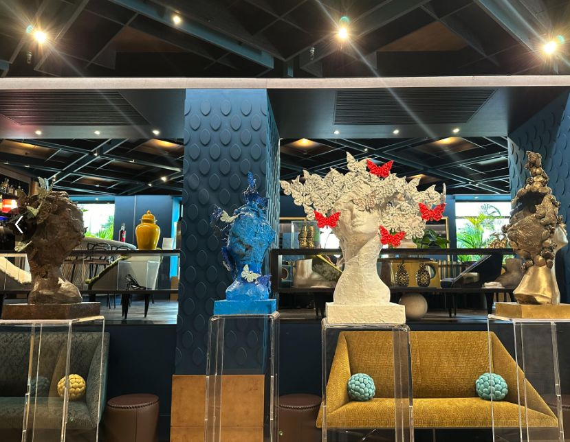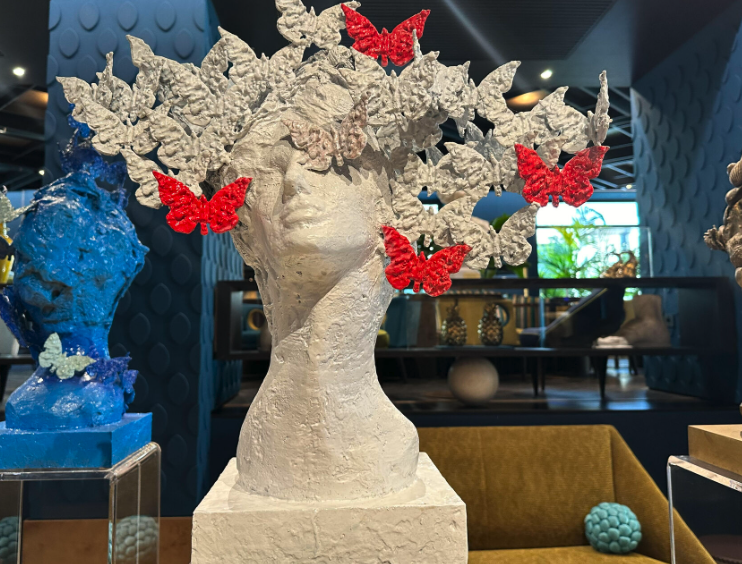 Le farfalle, simboli i di libertà, ma anche di cambiamento spirituale. Le conchiglie, immagine della casa ma anche il simbolo di Sina Hotels. Le donne creano una relazione di sintonia e armonia tra l’Artista e il luogo scelto per ospitarla.