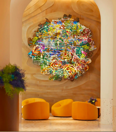 In effetti l’Arte sta molto a cuore al progetto di questo meraviglioso SO/Paris tanto che lo spazio è concepito come una galleria dove moda, architettura e arte contemporanea si mescolano. L’installazione “Reflections of Love” è un vero percorso immersivo ad opera dell’artista Judith Darmont che comincia nella Hall dell’albergo e vi guida fino all’ascensore e poi fino alla vostra stanza. L’agenzia di architettura RDAI firma un vero e proprio universo interiore dove Parigi si reinventa. Guillaume Henry, Direttore Artistico della Maison Patou, si è occupato delle divise del personale del SO/Paris. Con uno stile molto fresco e dinamico e scarpe da ginnastica ai piedi. Inoltre l’installazione ” The Seeing City” trasforma le vetrate della facciata del Ristorante e del Bar – situati al 15mo e 16mo piano – in una “macchina” che amplifica la percezione. Neil Beloufa con la sua opera di installazione attira maggiormente chiunque varchi la porta del SO/Paris, con ben 3 metri di diametro, conferisce una atmosfera POP all’ambiente. Thomas Fougeriol, è l’artista che si è occupato della decorazione delle camere con 113 fotogrammi unici e 5 fotomontaggi. Notoire invece ha firmato la decorazione al Bonnie Ristorante, Bar e Club. Con forme tonde, una moquette dai motivi floreali, dei colori caldi e vibranti, come un vero e proprio omaggio agli anni 60 e 70.
