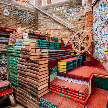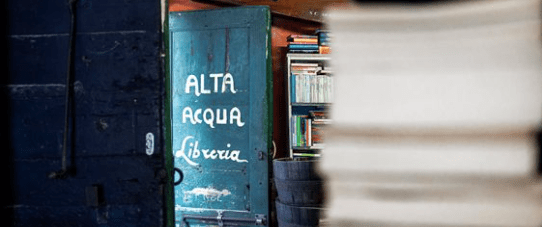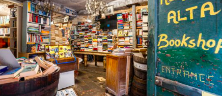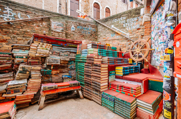Il nome della libreria significa letteralmente “Libreria delle Acque Alte”, il luogo è considerato un vero e proprio labirinto letterario, dove i visitatori una volta entrati si ritrovano davanti dei libri, passeggiando tra barche piene di pagine ingiallite dal tempo che conferiscono un fascino incredibile a questo luogo. Questo è sicuramente un angolo magico per tutti gli amanti dei libri e poi la libreria colpisce anche per la sua atmosfera bohémien, quel lato “zingaresco” che la rende speciale, infatti i volumi sono disposti in modo caotico e forse proprio questo è il fascino del luogo.