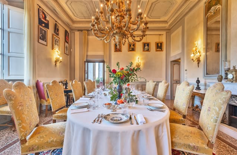 IG@mangiacane – Un maestoso lampadario, sedie di velluto e tavoli apparecchiati con cura: la sala da pranzo di Villa Mangiacane incarna un fascino senza tempo.