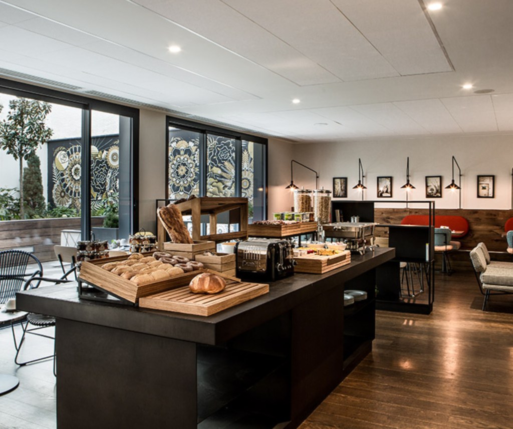 Accomodatevi nella insolita sala colazioni. Situata nel seminterrato dell’hotel, ma progettata per essere inondata di luce naturale, prendetevi il vostro tempo in un ambiente raffinato che si apre su una terrazza esterna, di fronte al pezzo forte della mostra, il murale “Mur végétal #3” appositamente creato dagli artisti SupaKitch & Koralie. Tavoli alti, una grande panca di legno per la condivisione, divani per l’intimità, un mix di materiali e sapori per iniziare bene la giornata con dolcezza casalinga e buona energia.