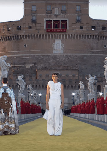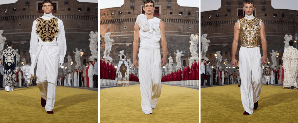 Martedì 15 luglio la moda si è trasferita in un’altra iconica location romana, il Ponte Sant’Angelo dove la vera protagonista è stata l’alta sartoria uomo ma anche quella sartoria ecclesiastica, una collaborazione di D&G con la famosa Sartoria Tirelli di Roma.