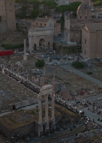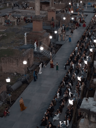 Poi la scena si è spostata ai Fori Imperiali, con una sfilata mozzafiato degli abiti della Casa di Moda Dolce & Gabbana tra le rovine di una Roma senza tempo.