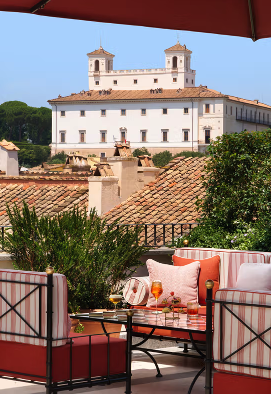 La terrazza si presta a diverse atmosfere ed esigenze per ogni occasione. Che si tratti di un tavolo conviviale, con i suoi ampi spazi, il quale accoglie calorosamente gruppi di amici, oppure un intimo “angolo degli innamorati”, il quale regala una vista d’eccezione sulla vicina Villa Medici Accademia di Francia, creando la cornice da sogno per brindisi romantici e anche baci rubati. Ogni soluzione è quella giusta. La colonna sonora sarà il cielo di Roma con i suoi colori cangianti, che non tradiscono mai.
