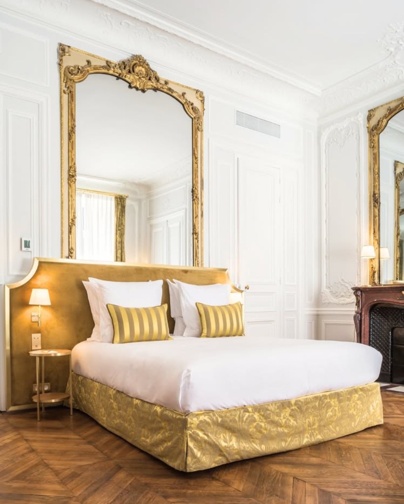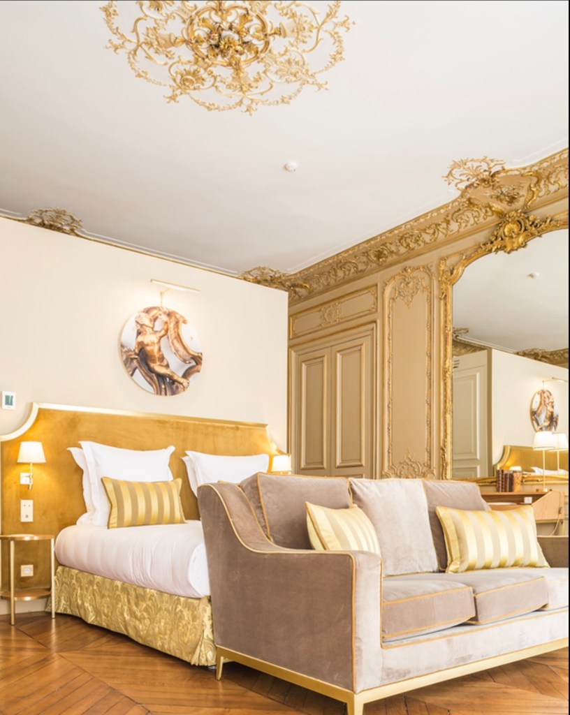 Ai piani superiori, 80 camere, di cui 20 suite, dove si mescolano materiali di lusso come pavimenti a spina di pesce, marmi, specchiere dipinte, dorature e una monumentale scalinata sostenuta da due cariatidi.
