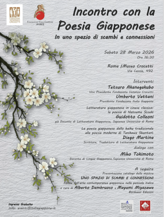 Il finissage inizierà con l’Incontro con la poesia giapponese, patrocinato dalla FUIS (Federazione Unitaria Italiana Scrittori) e organizzato insieme alla Fondazione Italia Giappone, a partire dalle 16.30. Dopo i saluti di Tetsuro Akanegakubo, Vicepresidente della Fondazione Crocetti, interverranno: