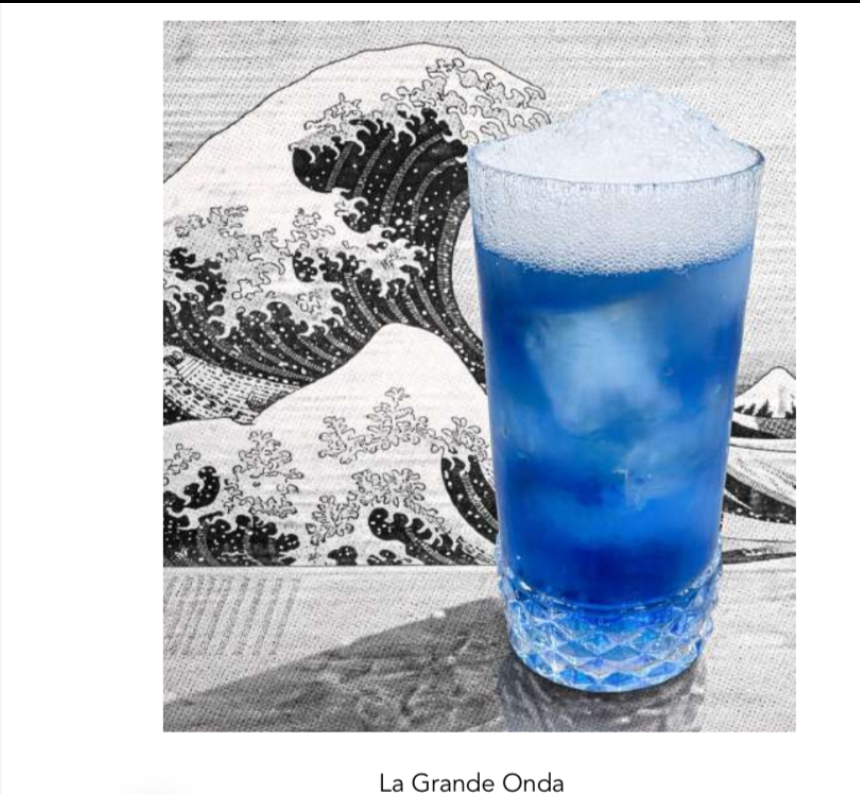 Il cocktail “La Grande Onda”, firmato dalla Head Bartender Sara Partenesi, trae ispirazione dall’omonima opera. Il Roku Gin apporta delicate note floreali di ciliegio, mentre l’Italicus Rosolio di Bergamotto aggiunge freschezza agrumata. Il liquore al lychee e l’acqua tonica conferiscono leggerezza e una nota fruttata, mentre una lieve soluzione salina richiama suggestioni marine. A completare il drink, una spuma al cocco e lychee, che ne esalta il profilo aromatico rendendolo ideale in abbinamento a piatti di pesce o di ispirazione orientale.