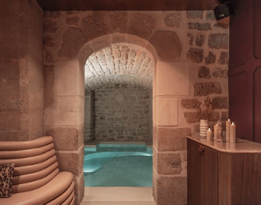 Scendiamo nelle sale da bagno Venus e Hédoné per una maggiore privacy. I 2 bagni privati sono fuori dal tempo, prendendo vita in un’atmosfera sommessa. Sono dedicati al piacere del corpo: vasca idromassaggio, doccia doppia, sauna o hammam, relax su grandi panche, bar, toletta e toilette. Il soffitto acquatico vi accompagna in questa esperienza che unisce bagni, vapore, sensualità e relax in un’architettura monastica. Su prenotazione per ospiti residenti e fuori città.